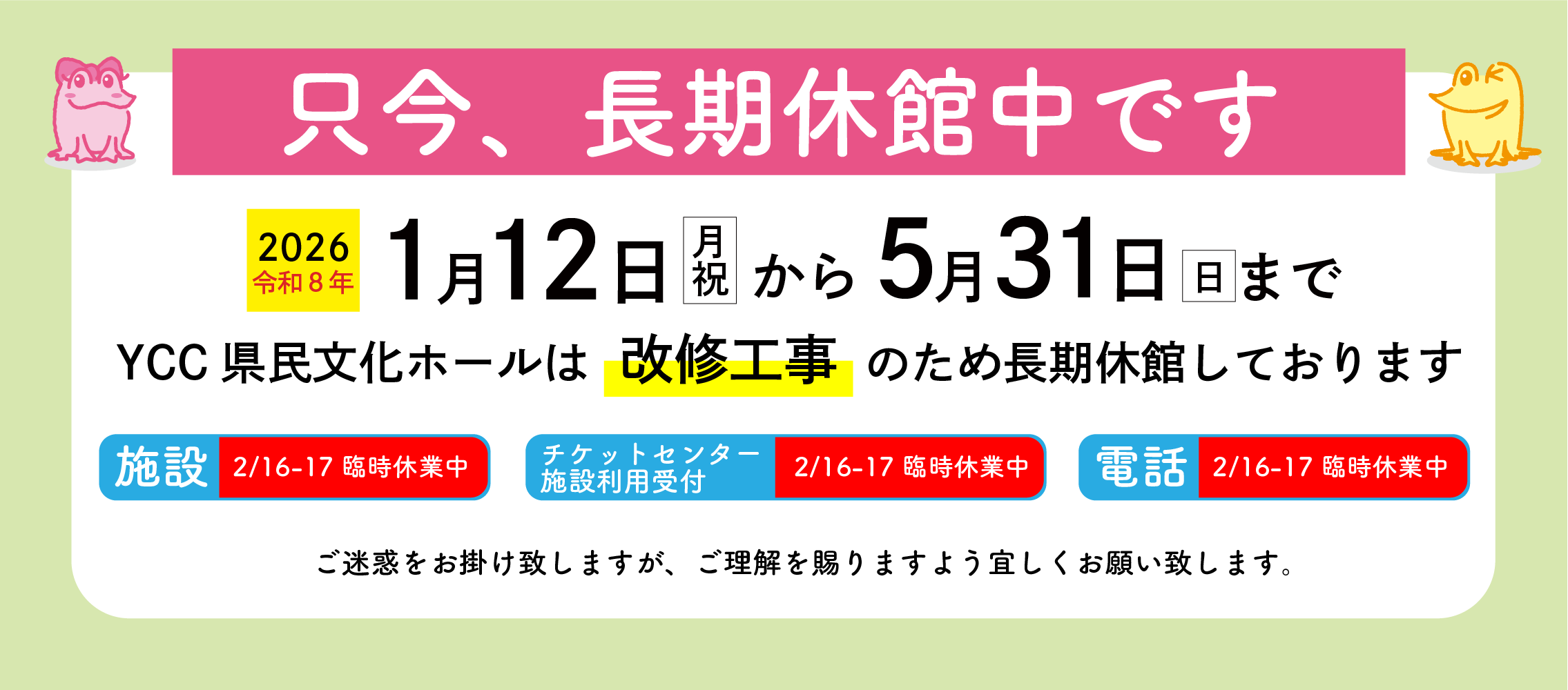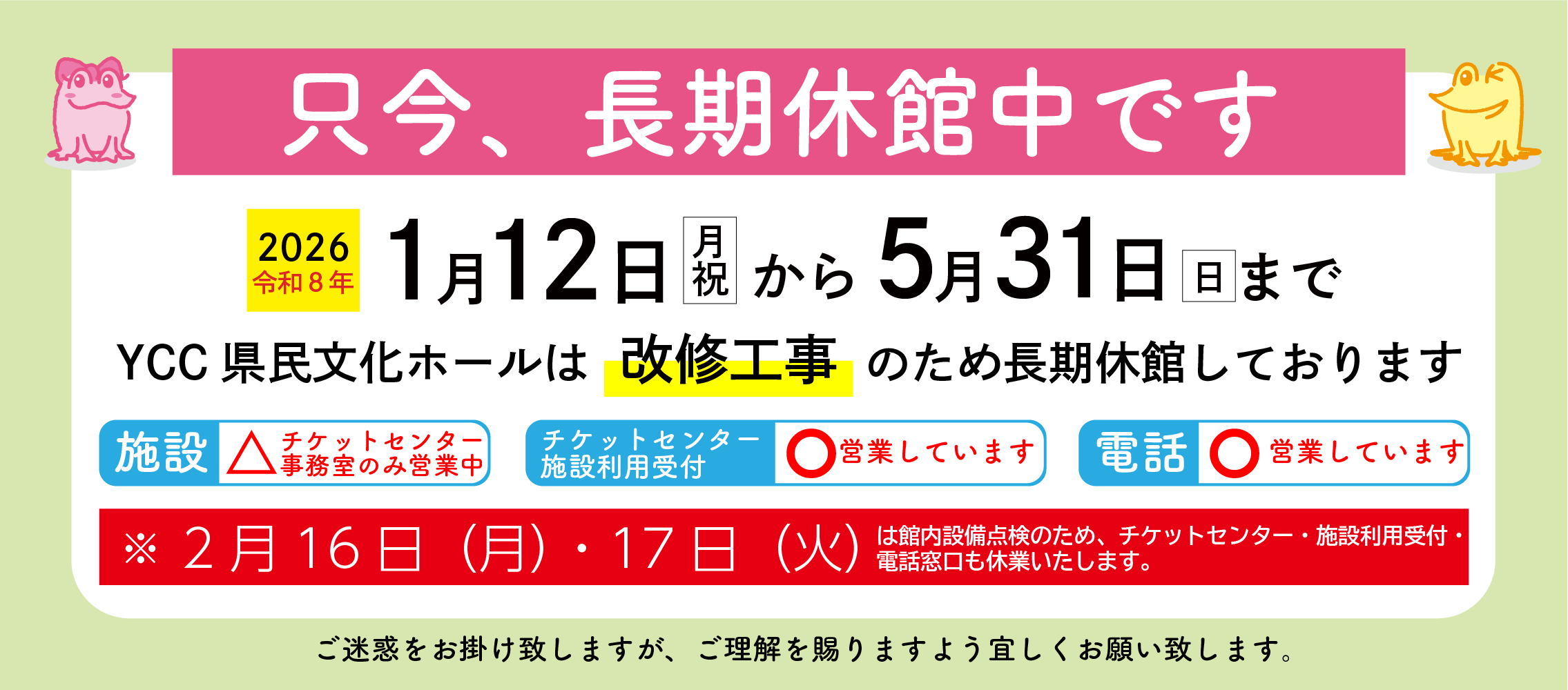 【重要】YCC県民文化ホール改修工事に伴う長期休館についてのお知らせ