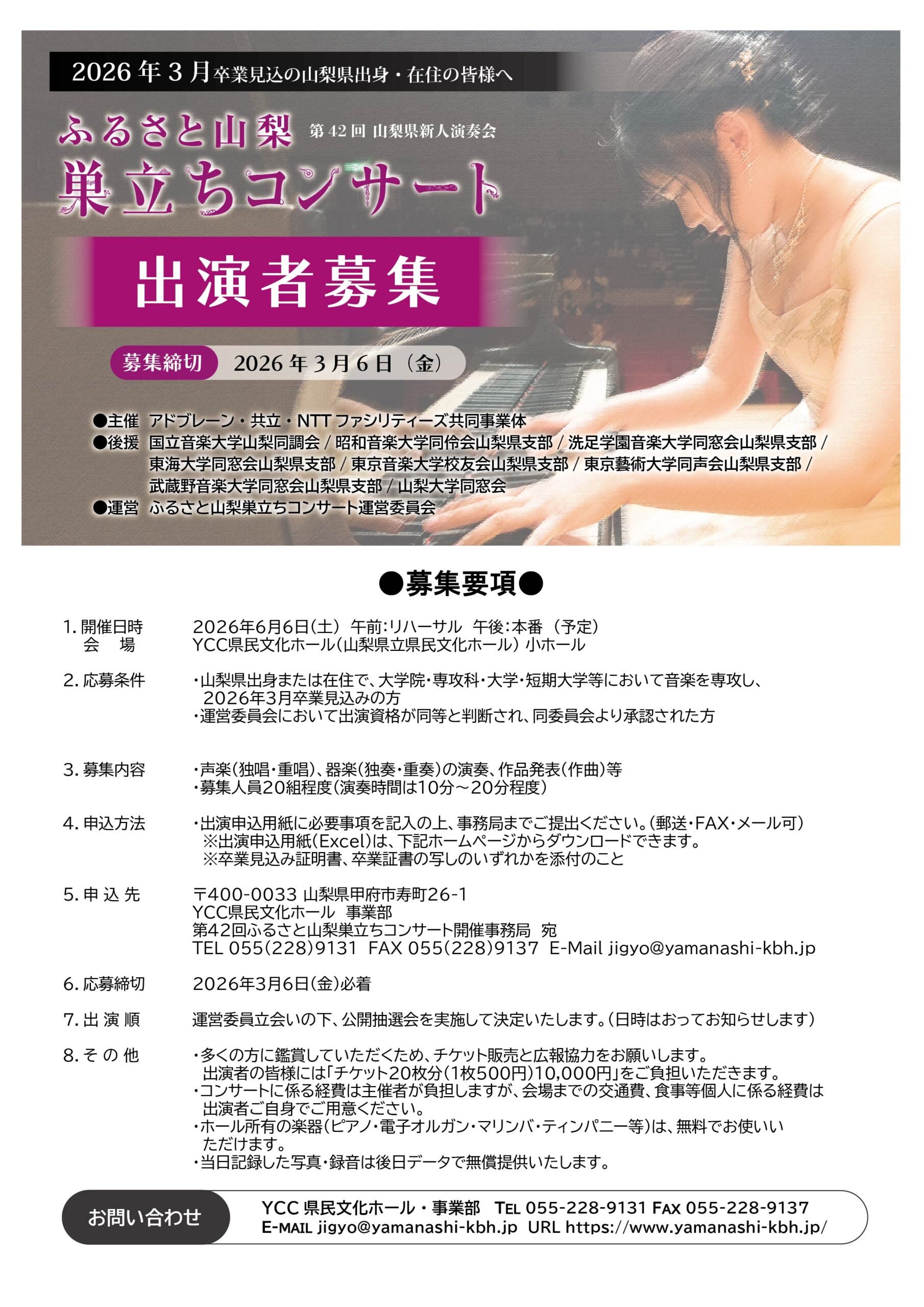 山梨出身の音楽科・音楽大学卒業生を中心とした「第42回 山梨県新人演奏会 ~ふるさと山梨巣立ちコンサート〜」を、2026年6月6日(土)に開催いたします。