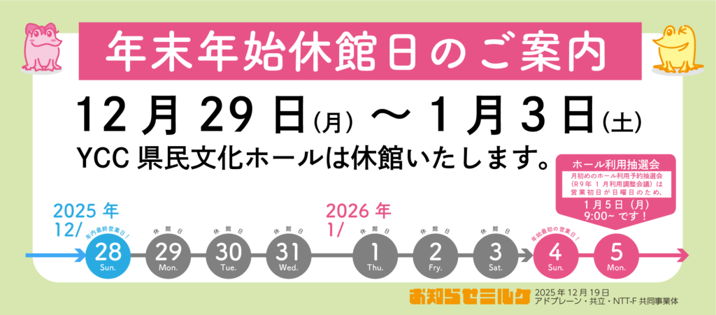 YCC県民文化ホールは2025年12月29日(月)~2026年1月3日(土)のあいだ、年末年始休館となります。 休館中は施設、駐車場、チケットセンター、および電話窓口すべてが休業となります。ご理解のほど、宜しくお願い致します。