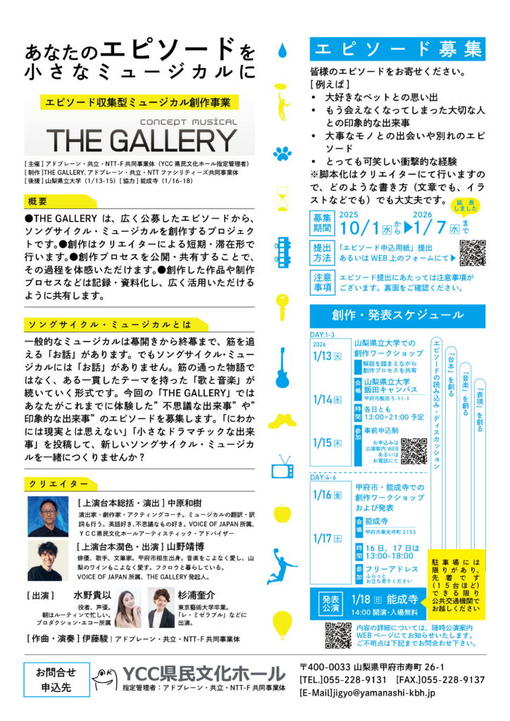 ●THE GALLERYは、広く公募したエピソードから、ソングサイクル・ミュージカルを創作するプロジェクトです。●創作はクリエイターによる短期・滞在形で行います。●創作プロセスを公開・共有することで、その過程を体感いただけます。●創作した作品や制作プロセスなどは記録・資料化し、広く活用いただけるように共有します。