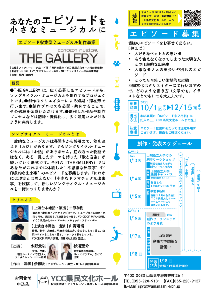 ●THE GALLERYは、広く公募したエピソードから、ソングサイクル・ミュージカルを創作するプロジェクトです。●創作はクリエイターによる短期・滞在形で行います。●創作プロセスを公開・共有することで、その過程を体感いただけます。●創作した作品や制作プロセスなどは記録・資料化し、広く活用いただけるように共有します。